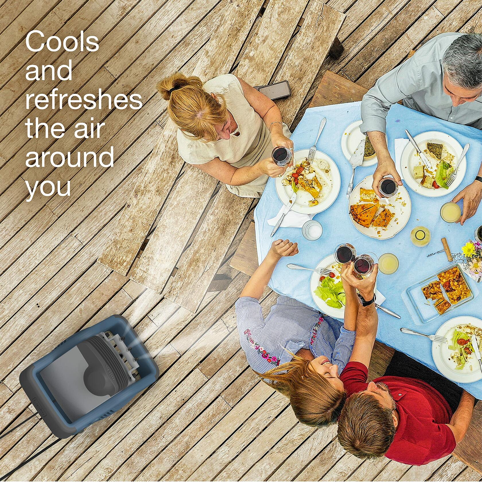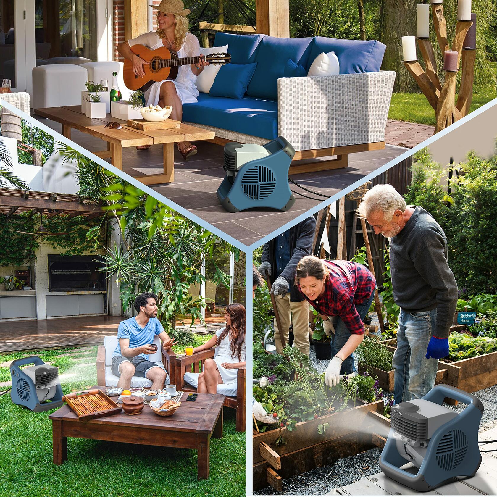 - COMPACT AND PORTABLEThis outdoor misting fan features a low profile for outdoor stability, The portable design measures just 6.25'' L x 12.3'' W x 14.85'' H and weighs 16.1 lbs., the misting kit detaches without tools for hassle-free cleaning